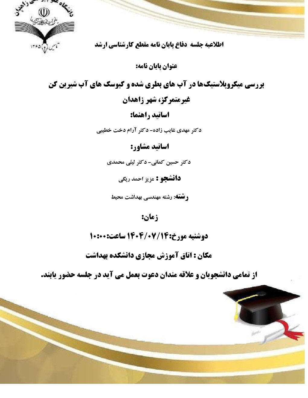 اطلاعیه جلسه دفاع پایان نامه کارشناسی ارشد آقای عزیز احمد ریگی گروه خبر : News کد خبر : 54733 کپی Keywords